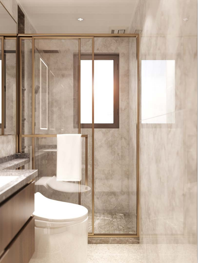 高级优雅的“倚天石”用在卫生间墙砖,亮光釉面易打理;经过精心组合搭配的浴室家具,提高了浴室空间的实用性和舒适感。