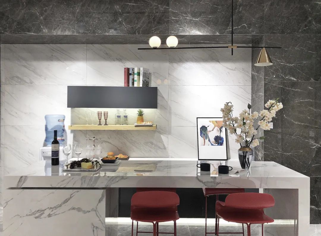 400*800 bright wall tiles "Star White" decorate the kitchen wall, matched with matte "Arctic Blue" marble floor tiles, clean and fresh, with a few bouquets of floral art, making life more refined.