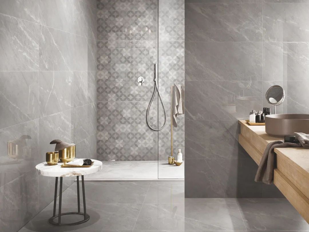 素雅的灰色调,流畅的条纹肌理,营造轻松舒适的洗浴环境。独特的植物图案花砖局部点缀,给予卫生间墙面别致的一面。The elegant gray tone and smooth striped texture create a relaxing and comfortable bathing environment. The unique plant-patterned tiles are partially embellished, giving the bathroom wall a unique side.