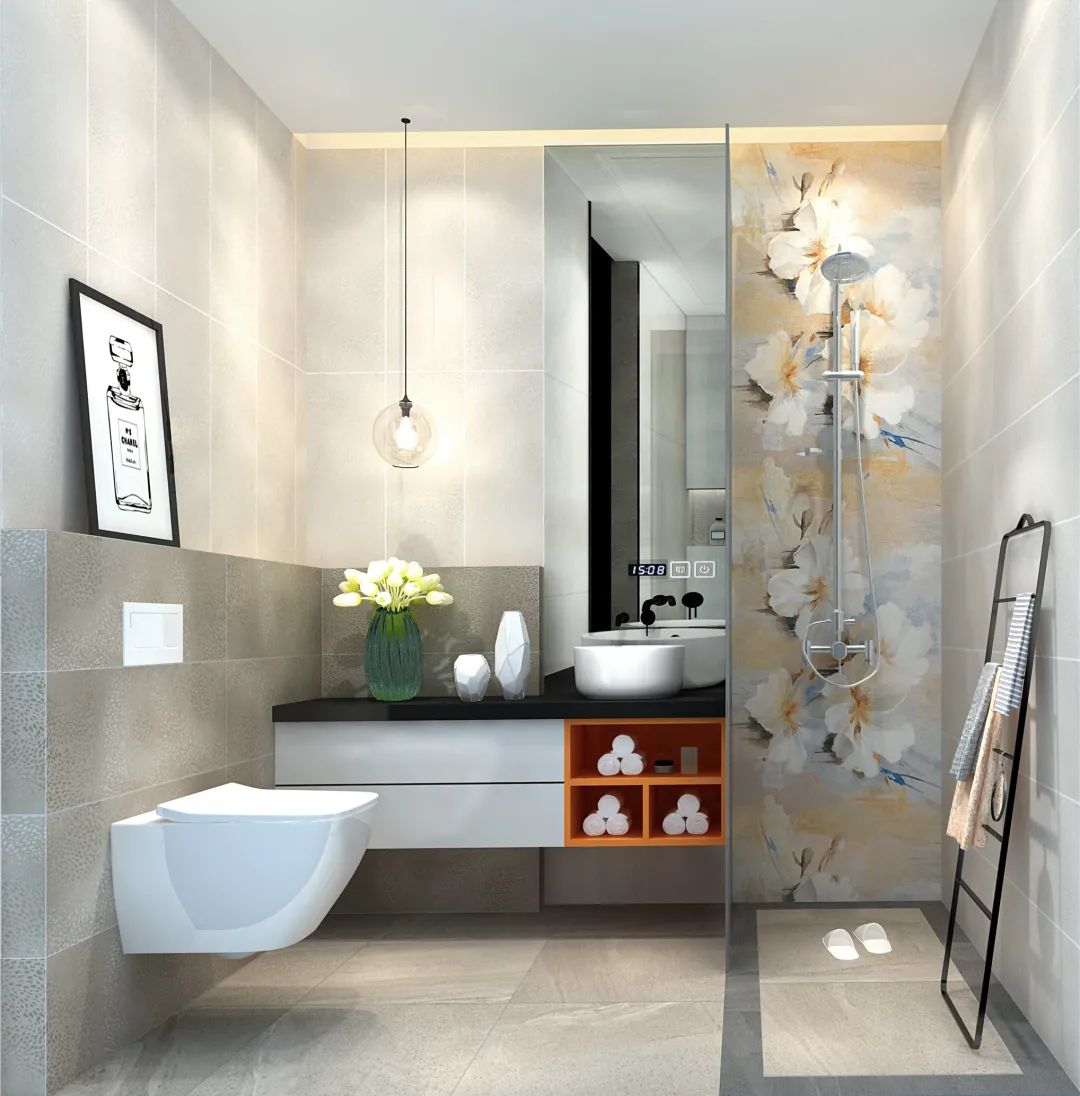 讲求简约与舒适并重的现代卫生间,彩色花砖的点缀,让空间不乏单调,反而多了一份艺术气息。A modern bathroom that emphasizes both simplicity and comfort, and the embellishment of colorful tiles, makes the space not lacking in monotony, but adds a sense of art.