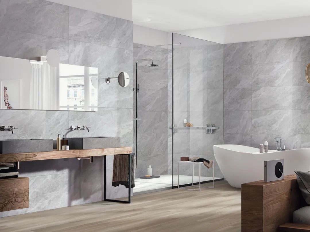“土耳其砂岩”同一系列两款不同灰度的墙砖,清晰地划分着卫生间不同的功能区,营造强烈的空间层次感。"Turkish Sandstone" two wall tiles with different gray levels in the same series clearly divide the different functional areas of the bathroom, creating a strong sense of spatial hierarchy.