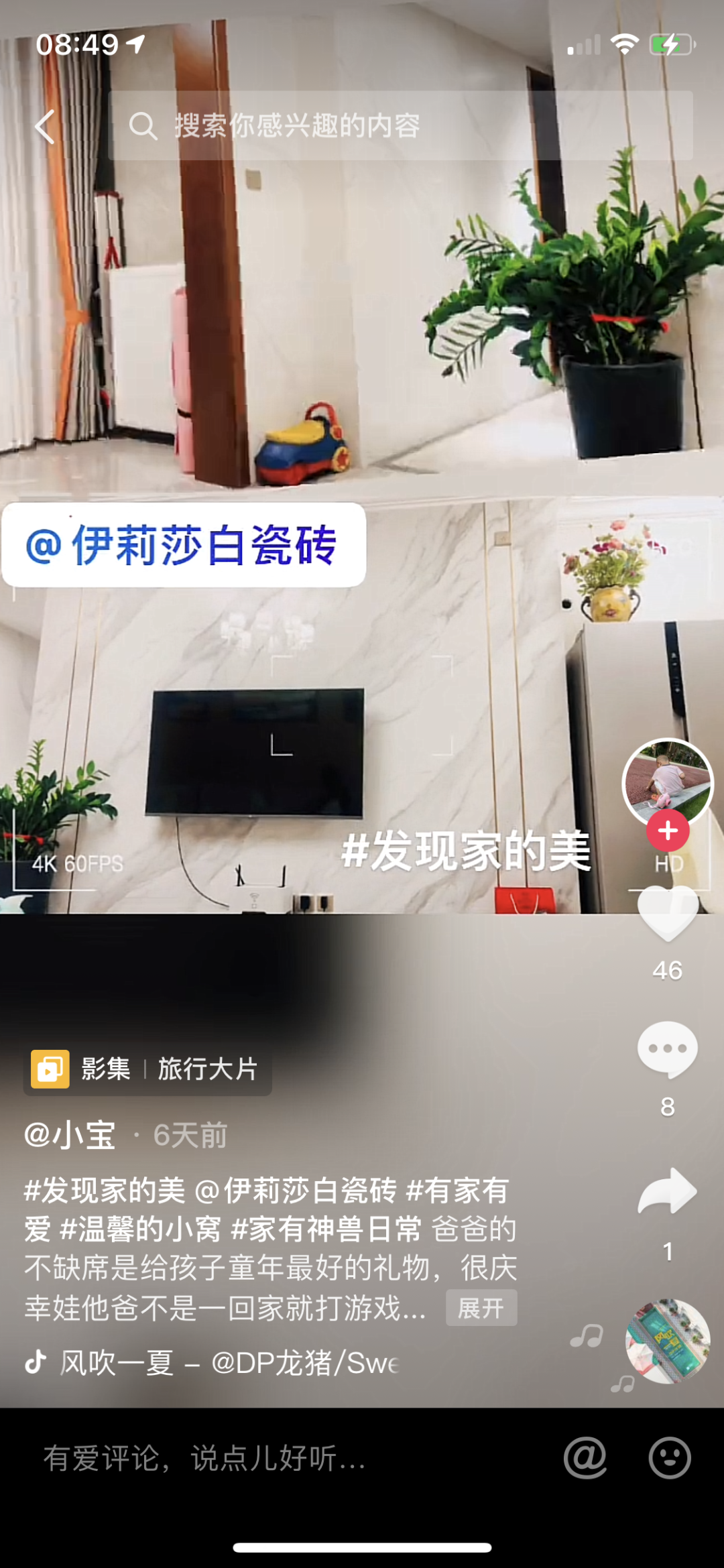 4. 在抖音发布参赛作品,发布时添加话题#发现家的美并@伊莉莎白瓷砖;