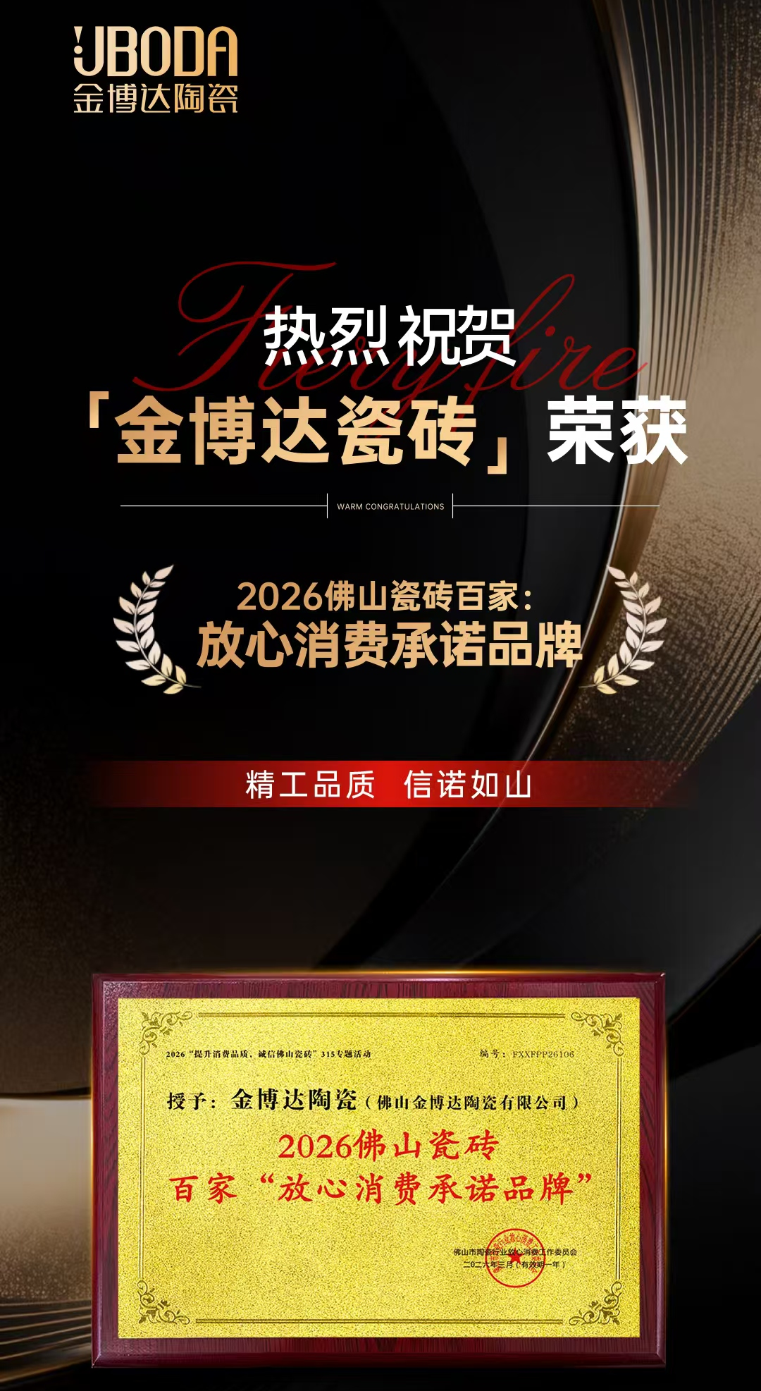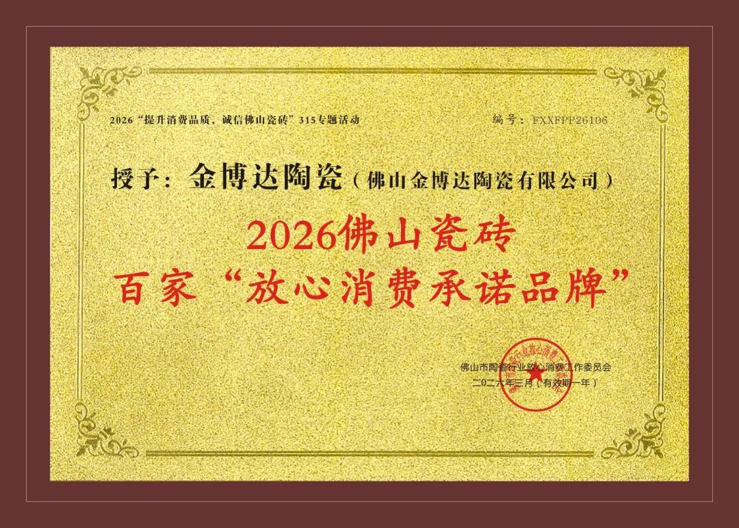 荣誉加冕是肯定,更是前行的动力。此次荣膺2026佛山陶瓷“放心消费承诺品牌”,是金博达瓷砖坚守品质、深耕创新、用心服务的成果体现。